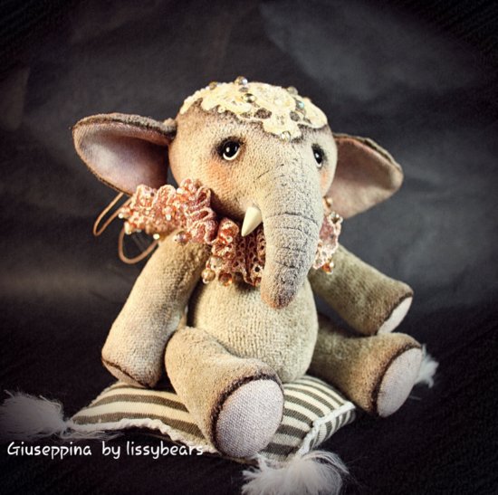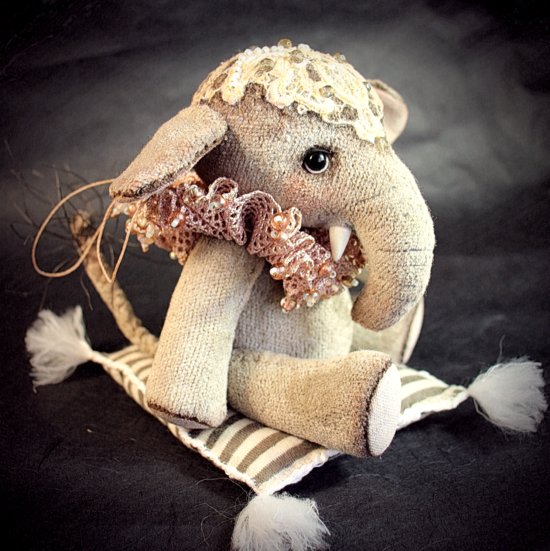 Giuseppina the elephant girl wears a beautiful lace collar with beads stitched on in cooper and white.