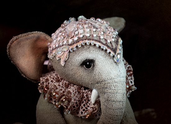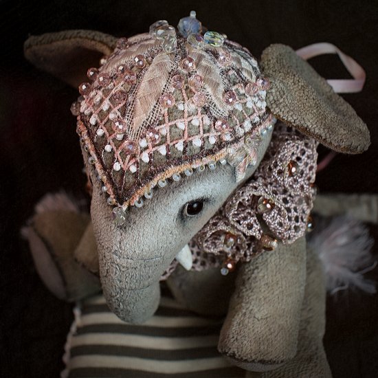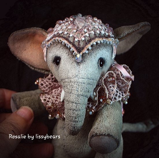 Rosalie elephant has German black glass eyes and two cutest little teeth modeled from Apoxie Sculpt, white painted.