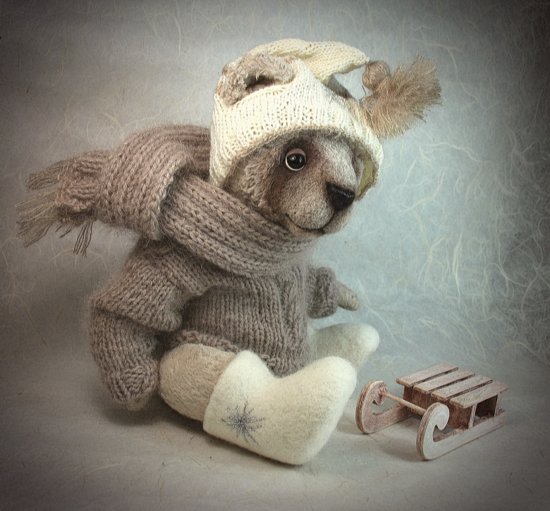 Marlon is a winter bear warm dressed in knitted outfits, made from Babymohair wool with silklace wool.